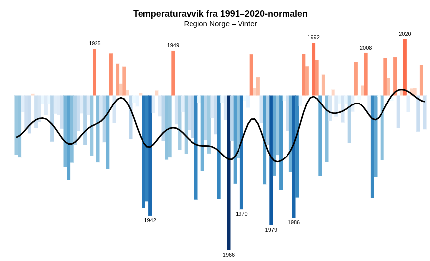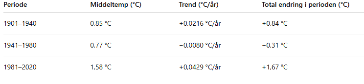 Det som er fakta er at klimaet i Norge er endret, og årsmiddeltemperaturen for landet som helhet er ca 1,3 grader høyere i 2026 enn for over 100 år siden. 1,3 grader brukes også om den globale økningen.